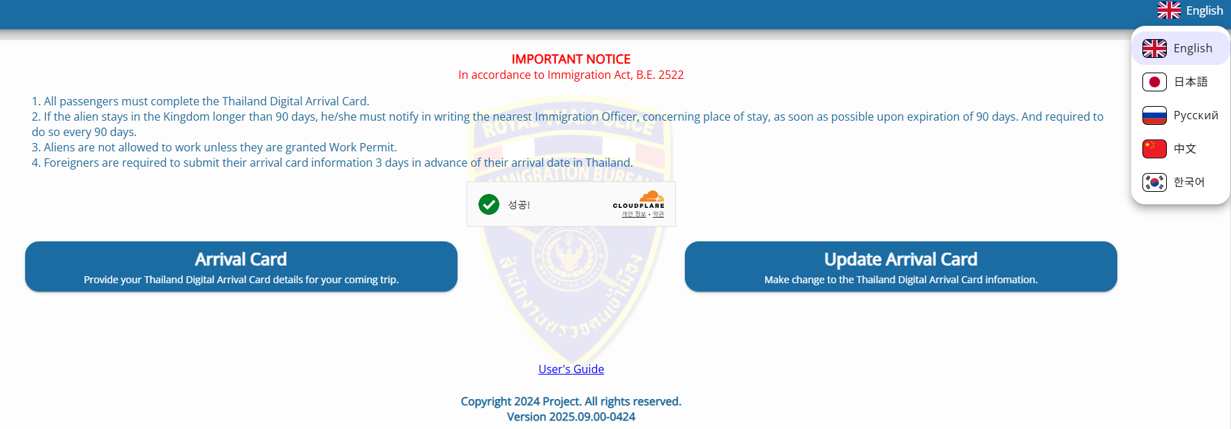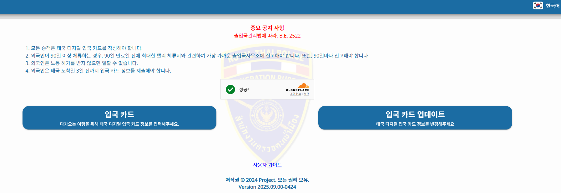 1. TDAC 홈페이지(http://tdac.immigration.go.th)에 접속(필요시 우측 상단 언어 변경을 통해 한국어로 전환)