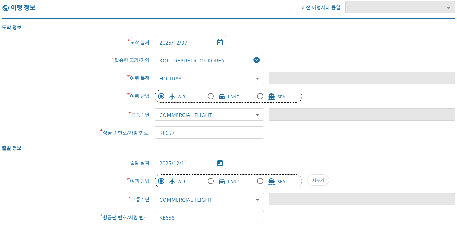 체크 포인트: 항공편 정보와 체류 장소는 실제 예약한 내용을 기준으로 입력해야 하며, 허위 작성 시 입국 심사에서 문제가 생길 수 있습니다.
