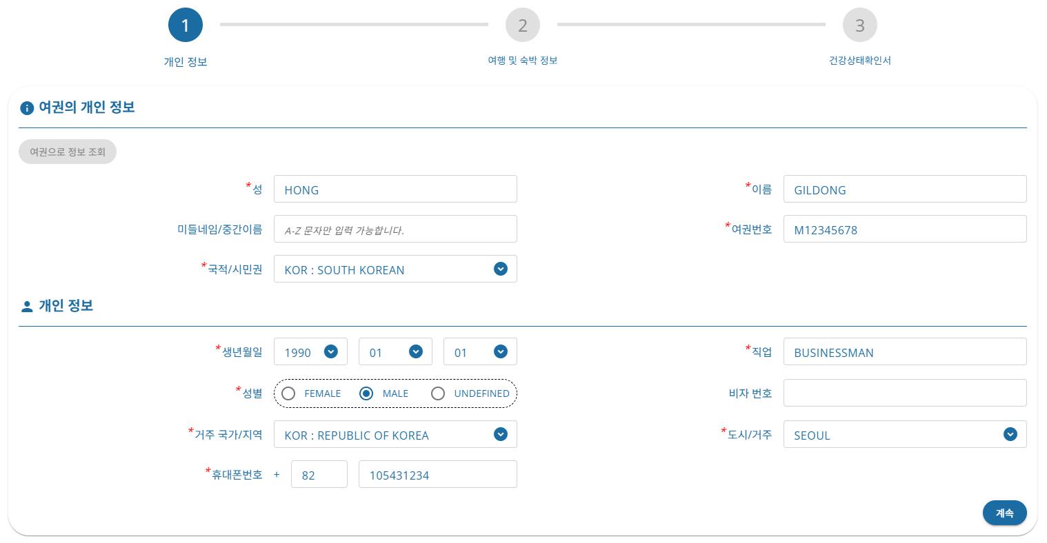 여행자의 신원을 확인할 수 있는 기본 정보를 입력하게 됩니다.