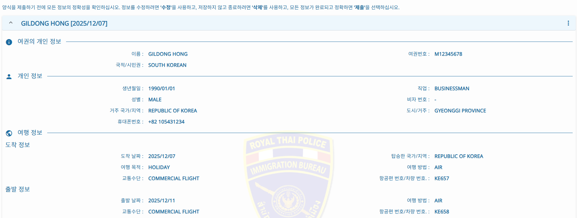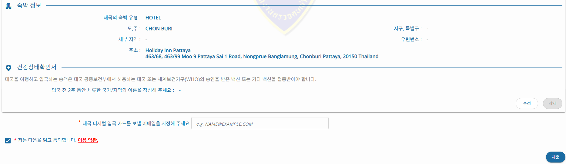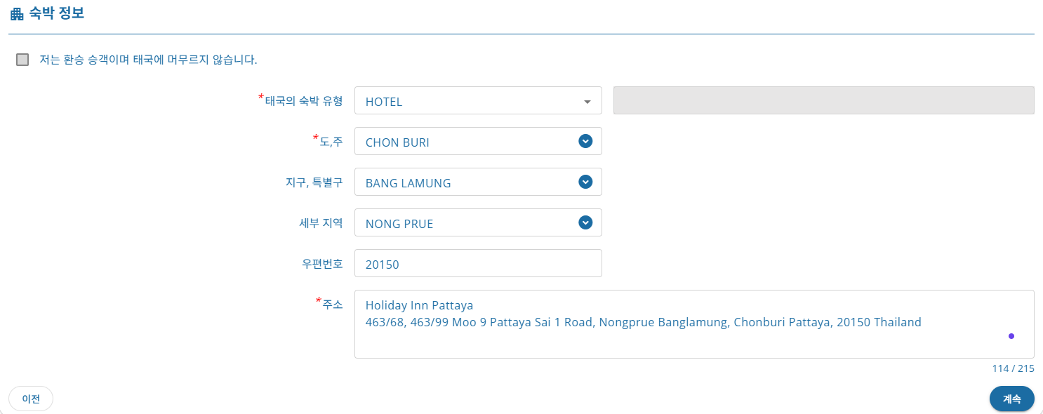 2. 홈페이지 안내에 따라 개인정보(성명, 국적, 전화번호, 이메일 주소, 여권 정보), 여행 정보(항공편 번호, 여행 목적, 태국 내 주소) 등 입력
