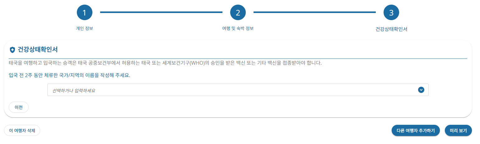 이 단계는 개인의 건강 정보를 바탕으로 태국 입국 심사 기준을 충족하는지를 사전에 판단하기 위한 용도이므로, 반드시 사실대로 기재해야 합니다.